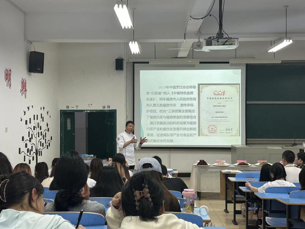 5月27日,我院邀请宁德市朗悦酒店管理有限公司副总经理、行政总厨、高级技师刘元建先生开展“传播宁德家乡非遗美食”的主题讲座。刘副总从闽东餐饮业发展、宁德名茶、福鼎白茶宴、茶膳的意义及制作等多个方面全面展示了宁德家乡非遗美食,分享白茶宴的制作与益处,讲解福鼎白茶在餐饮业中的广泛应用及跨界融合所带来双效益。通过自身对闽东美食的探索与钻研,向在场师生展示一场别开生面的非遗美食,告诉学生只要踏实努力,三百六十行,行行都能出精彩。并且用事实论证了发展道路上融合创新的重要性,对促进闽东茶叶和食品双产业的融合协同发展有重要指导作用。